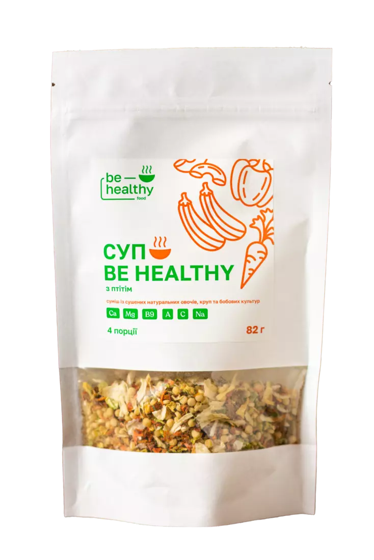 Назва супу Be healthy від ТМ BE HEALTHY FOOD говорить самам за себе - Будь здоровим! Адже в даному супі поєднано велика кількість овочів та трав, які включають в себе наймовірну кількість корисних речовин необхідних для кожного щодня. А макаронні вироби з твердих сортів пшениці наситять організм рослинним білком, складними вуглеводами та вітамінами групи В, що дасть відчуття ситості без шкоди для здоров`я. Все, що вам потрібно для приготування - засипати суміш в киплячий бульйон/воду та зварити за вказаним часом.