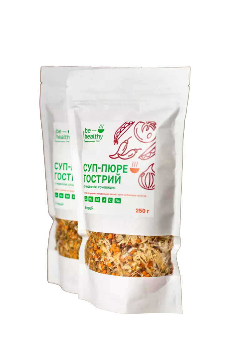 Суп-пюре "Гострий" від ТМ BE HEALTHY FOOD - це неймовірно ароматне блюдо та чудове блюдо, яке найкраще готувати в холодну зимову пору. Він чудово втамовує апетит, покращує травлення і зігріває, застосування гострого перцю чилі, надає супу особливої приємною пекучості, яка, до того ж, ще й розганяє метаболізм. Все, що вам потрібно для приготування - засипати суміш в киплячий бульйон/воду та зварити за вказаним часом.