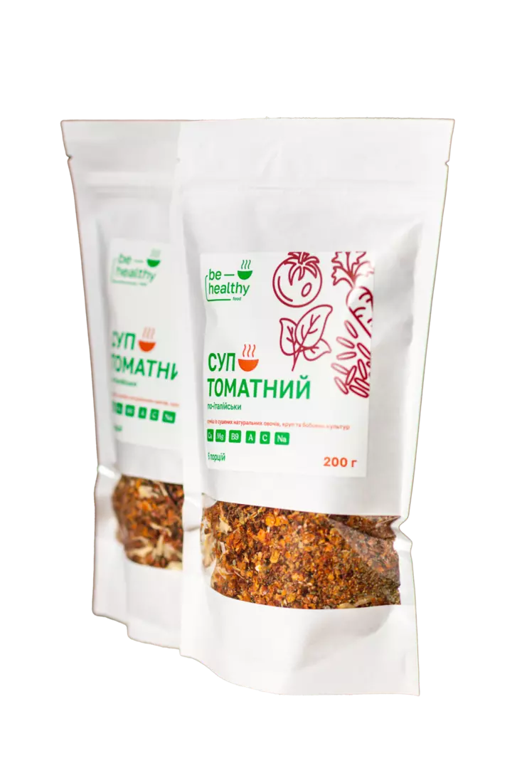 Суп "Томатний" від ТМ BE HEALTHY FOOD - смачний, легкий, а ще й корисний томатний суп-пюре з базиліком, часником та орегано, в основі якого справжні українські томати (70%). На відміну від багатьох інших супів, може подаватися як гарячим, так і холодним. Все, що вам потрібно для приготування - засипати суміш в киплячий бульйон/воду та зварити за вказаним часом.